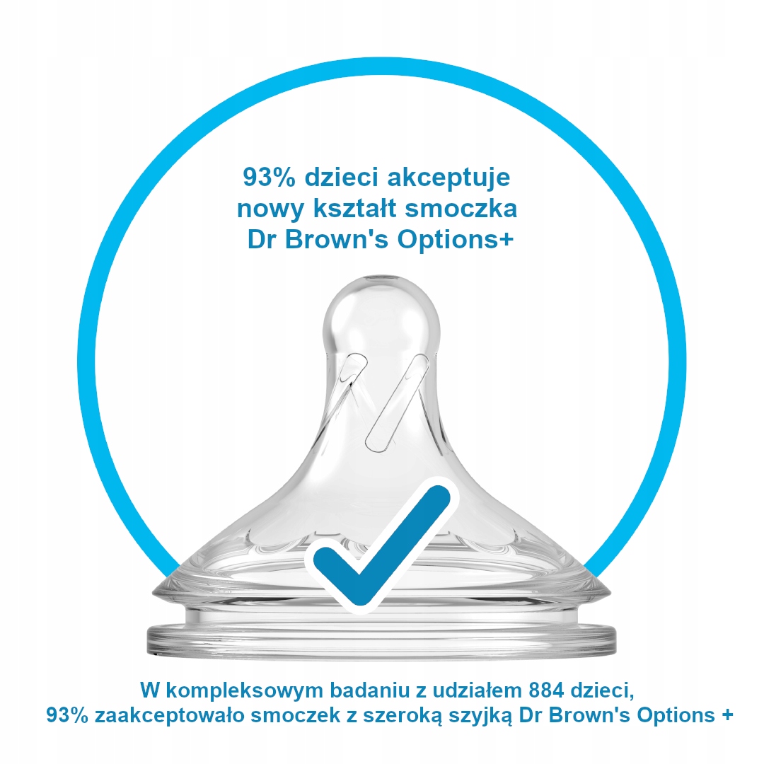 Dzięki 93% wskaźnikowi akceptacji nie będziesz musiał się zastanawiać, czy Twoje dziecko pokocha butelkę Dr Brown’s Options+. W kompleksowym badaniu z udziałem 884 dzieci, 93% zaakceptowało smoczek z szeroką szyjką Dr Brown’s Options +. Smoczek został specjalnie zaprojektowany, aby zaoferować podobny przepływ jak podczas karmienia naturalnego. Dzięki połączeniu systemu odpowietrzającego i nowego smoczka, przejście z karmienia piersią do butelki i odwrotnie, będzie jeszcze łatwiejsze. Butelka z wolnym przepływem, właściwa dla maluszków karmionych piersią, nie powoduje, że dziecko się „rozleniwia” oraz nie zaburza odruchu ssania.
